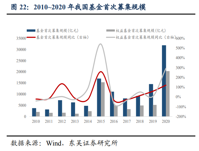 2015年,我國(guó)基金首次募集規(guī)模較2014年暴增,是2014年3倍多。可那一年透支了居民幾年的基金購買力,而牛市后的狂跌也讓基民幾年后才解套,直到2020年才重拾對(duì)基金的信念。