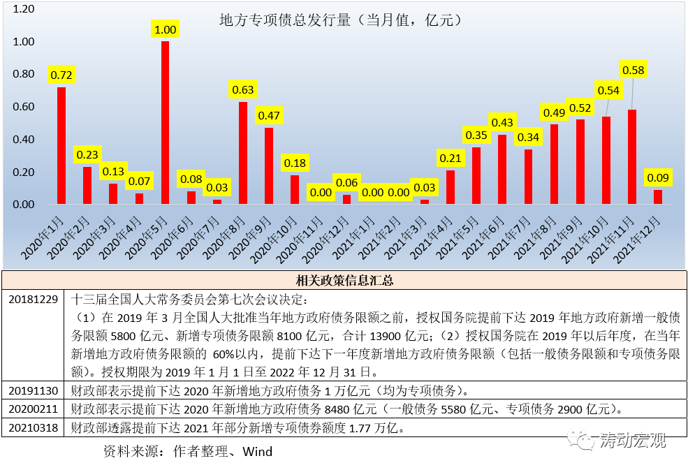 中央經濟工作會議提及“適當超前開展基礎設施投資”(參見2021年中央經濟工作會議釋放十大重磅信號),符合穩增長與保就業的政策導向,也意味著專項債將會在2022年發力。為此,2021年12月16日,財政部副部長許宏才、預算司負責人兼政府債務研究和評估中心主任宋其超出席政策例行吹風會,有以下幾個信號值得關注: