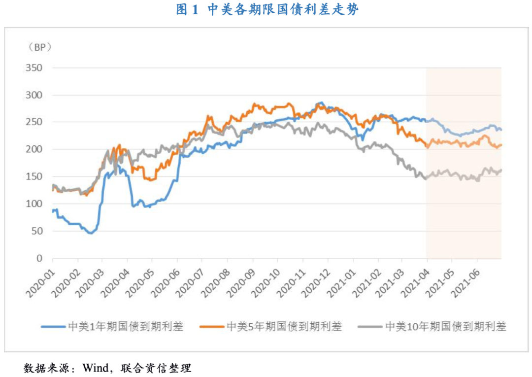 從中國貨幣政策看,隨著疫苗接種的持續推進,國內經濟保持穩定恢復,內生動力加強,央行貨幣政策保持松緊適度,并綜合運用多種貨幣政策工具,通過公開市場操作、中期借貸便利(MLF)、定向中期借貸便利(TMLF)、常備借貸便利(SLF)以及央行票據互換等工具維持市場流動性的合理充裕。在此背景下,中國國債收益率在2021年二季度總體呈下行態勢,且下行幅度超過美債收益率下行幅度。