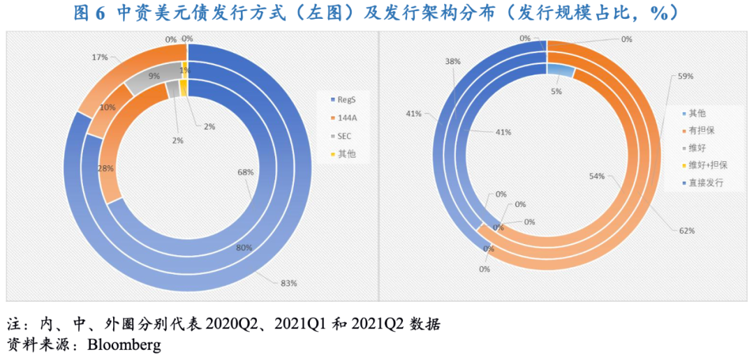 從發行架構看,2021年二季度,擔保發行和直接發行仍是中資美元債最主要的兩種發行方式。具體來看,擔保發行債券合計達到277.8億美元(105期),約占總規模的58.9%,環比下降3.1個百分點,同比上漲4.6個百分點;直接發行債券共48期,發行金額達到194.0億美元,占總規模比為41.1%,環比和同比分別上升3.2個和0.5個百分點;本季度沒有以維好架構以及擔保+維好雙重架構增信的中資美元債,表明市場對于維好架構的增信作用越來越不認可。