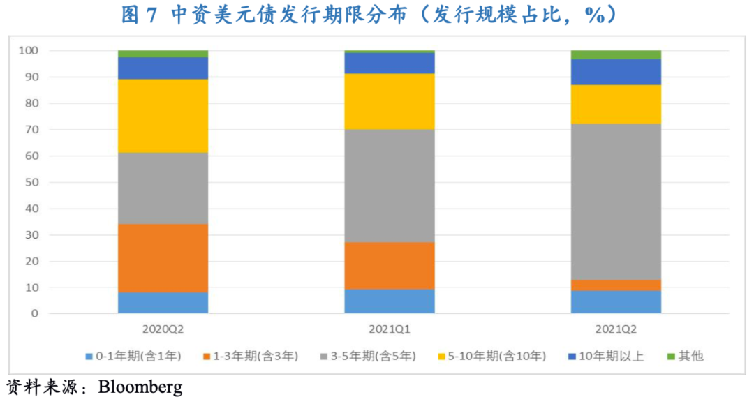 從美國貨幣政策看,盡管今年以來美國通脹持續走高,但美聯儲一直堅稱物價上漲是“不可持續的”,認為疫情沖擊導致的供求失衡是“暫時的”,隨著疫情封鎖進一步放松、供需逐步趨向平衡,通脹終將消退。因此,美聯儲在6月的議息會議上維持了寬松貨幣政策立場不變,但開始討論縮減購債規模的時間,向市場提前傳遞部分轉向信號。另一方面,2021年二季度以來,美國國內疫情仍有反復,盡管疫苗接種正在穩步推進,但隨著傳播性更強的Delta變異毒株出現,美國疫情防控形勢仍不容樂觀;從經濟數據表現來看,美國4月和5月非農就業數據接連不及預期,在一定程度上引發了市場對于美國經濟復蘇前景的擔憂;自拜登3月底提出2.3萬億美元的基建法案以來,其推進進程一直受到共和黨阻礙,預算規模也不斷縮減,使得市場對于美國經濟復蘇的預期進一步下降。在多重因素的作用下,2021年二季度市場避險情緒有所走高,推動各期限美國國債收益率較一季度整體回落,尤其是中長期國債收益率下行幅度更大。截至6月30日,1年期、5年期和10年美債收益率降至0.07%、0.87%和1.45%的低位。美債收益率回落有利于降低中資美元債的發行成本,吸引更多的潛在發行人進入市場。