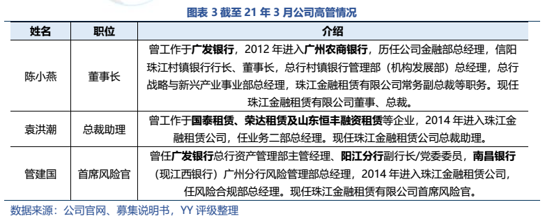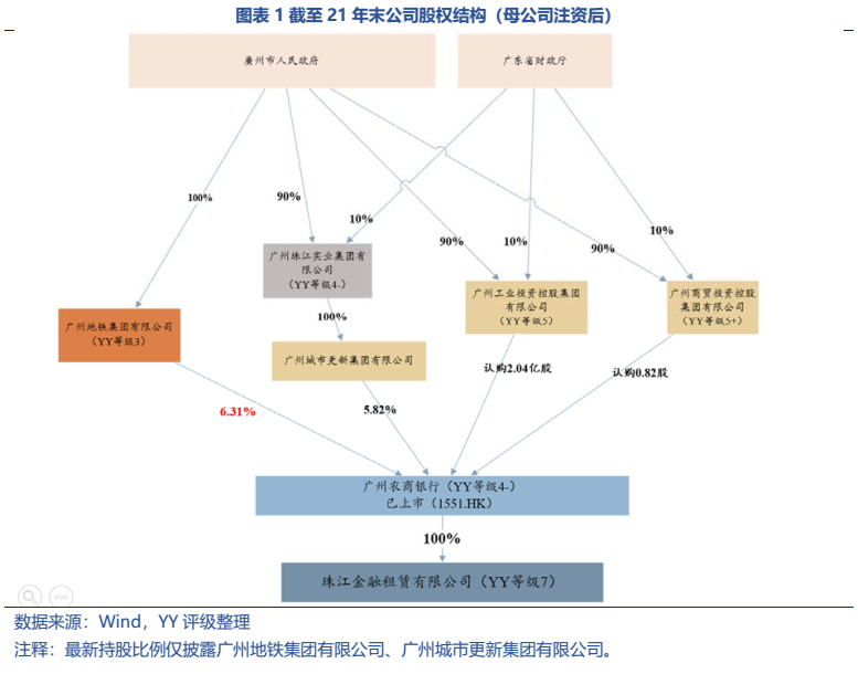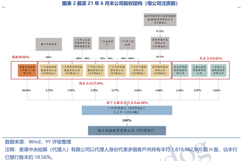 珠江金融租賃有限公司YY評級7,2014年成立,20年末總資產規模約167.49億元,體量較小。其母公司廣州農商行19年在港股上市(1551.HK),21年末增資后,廣州地鐵以6.31%的持股取代廣州金控成為第一大股東。