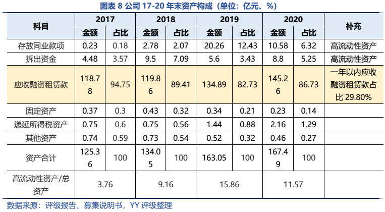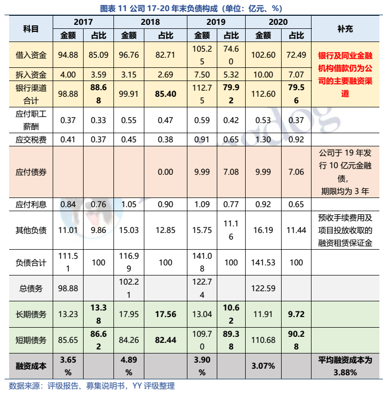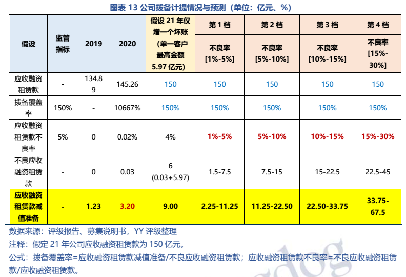 雖然20年公司才出現第一筆不良資產(一筆醫院租賃項目,0.03億元),但20年以來受疫情等因素影響較多,當前公司的關注+不良資產應有較大幅度上升。故本文將公司的不良率分成四個檔次,分別計算出不同情況下所需計提的壞賬準備金額。結果顯示,因公司成立初期拓客渠道有限,大中型客戶較多,整體客戶集中度較高,再加上基數較小(資產規模小、計提準備金也小),只要有一筆大單客戶成為壞賬,公司的計提壓力就會有顯著拉升(整體測算過程較悲觀,僅作為模糊體現公司壞賬壓力的量化結果,實際情況有待公開信息披露)。在極端情況下,母公司的資金援助將成為公司抗風險的關鍵。