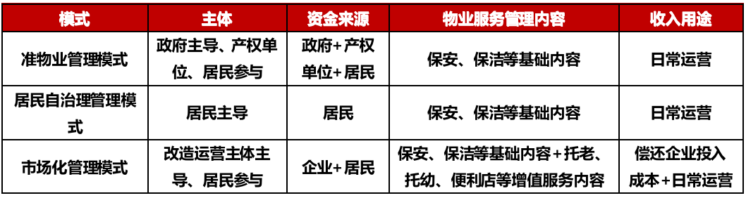 市場(chǎng)化管理模式。這種模式是通過(guò)社會(huì)資本的投資,對(duì)老舊小區(qū)的基礎(chǔ)設(shè)施、公共服務(wù)設(shè)施等進(jìn)行改造,改善居民基礎(chǔ)生活環(huán)境、提高居民生活便利度,如,改造停車(chē)場(chǎng)、增加養(yǎng)老、醫(yī)療、家政、快遞、便利店等。這種模式在覆蓋基礎(chǔ)物業(yè)服務(wù)內(nèi)容基礎(chǔ)上,會(huì)同時(shí)覆蓋多種增值服務(wù)內(nèi)容。相應(yīng)的,小區(qū)后續(xù)的物業(yè)管理、政府補(bǔ)貼、服務(wù)收費(fèi)、商業(yè)收費(fèi)等收益,也歸為其所有。