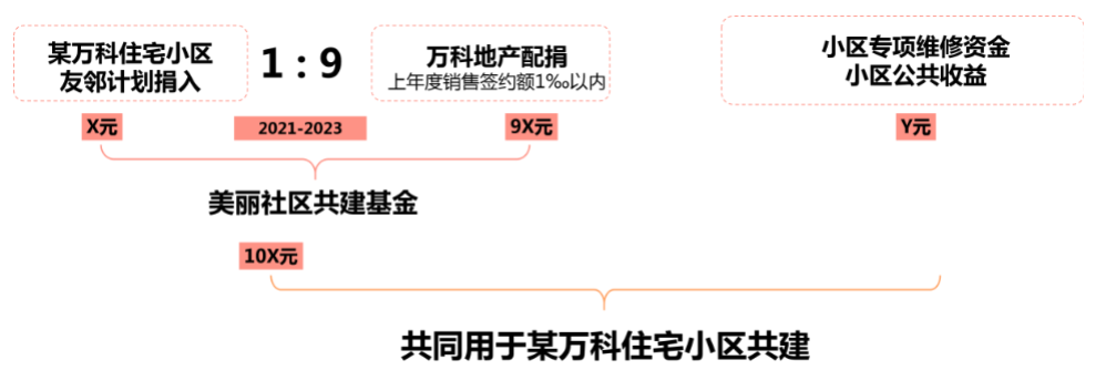 萬(wàn)科地產(chǎn)美麗社區(qū)計(jì)劃預(yù)備資金首期將按照9:1的比例與萬(wàn)科物業(yè)“友鄰計(jì)劃”募集的資金進(jìn)行配捐,萬(wàn)科地產(chǎn)配捐資金從上一年度銷(xiāo)售簽約的千分之一中分配。在具體項(xiàng)目使用上,將與各萬(wàn)科小區(qū)的專(zhuān)項(xiàng)維修資金、公共收益配合使用,進(jìn)一步緩解入住滿(mǎn)五年的萬(wàn)科小區(qū)在更新改造方面資金不足的問(wèn)題。