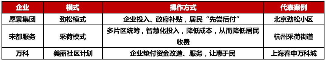 目前全國(guó)老舊小區(qū)改造的體量依然很大,完全依靠以政府為主導(dǎo)的準(zhǔn)物業(yè)管理很不現(xiàn)實(shí);老舊小區(qū)居民對(duì)高品質(zhì)的物業(yè)服務(wù)仍有一定的需求,居民自治管理仍屬于治標(biāo)不治本的暫時(shí)性解決方案;引入社會(huì)資本的模式一方面能緩解政府財(cái)政壓力,同時(shí)又能讓專(zhuān)業(yè)的物業(yè)企業(yè)參與進(jìn)來(lái),提升老舊小區(qū)的服務(wù)品質(zhì),愿景集團(tuán)、宋都服務(wù)、萬(wàn)科等企業(yè)已參與其中。