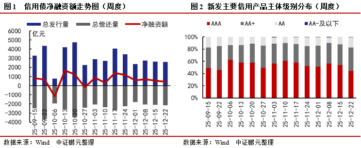 上周(2025/12/22-2025/12/28)非金融企業信用債凈融資447.68億元,環比下降20.12%,發行規模為2,585.03億元,環比下降2.44%,償還規模為2,137.35億元,環比增加2.30%。