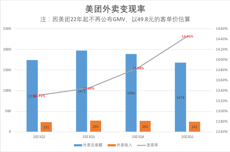 如果按照美團2021年平均約49元的客單價計算,2022年第一季度的變現率約為14.67%;即使以券商推算的較高值49.8元進行計算,變現率仍然達到14.46%,依然是歷史新高。