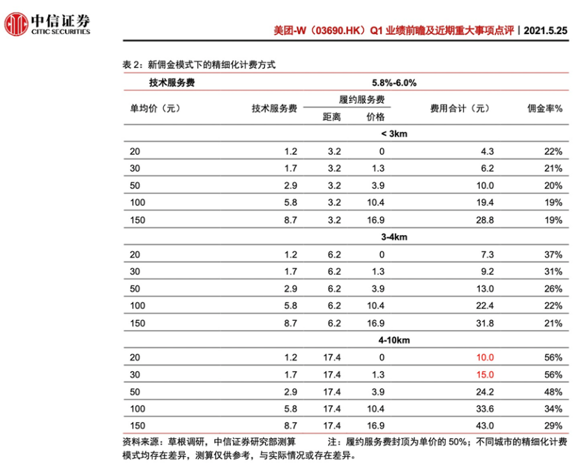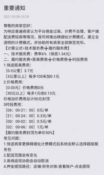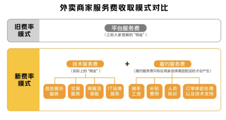 2021年初,為緩解監管壓力和商家爭議,美團開始了傭金“透明化改革”,將原先按比例收取的傭金,拆分成技術服務費和履約服務費兩部分,并通過時間分段計費和距離分段計費的方式對履約服務費進行約定。