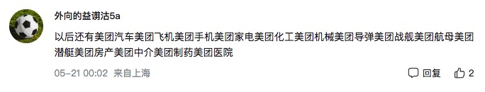 “以后還有美團汽車、美團飛機、美團手機、美團家電、美團化工、美團機械、美團導彈、美團戰艦、美團航母、美團潛艇、美團房產、美團中介、美團制藥和美團醫院。”