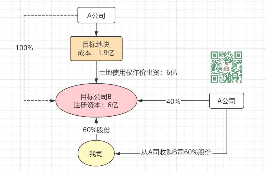 2.【土地作價入股】:A公司單獨成立項目公司。該地政府對于土地作價入股,不視同土地使用權轉讓,不受25%投資額的要求。目標地塊評估價6億元(原始成本1.9億),全部進注冊資本金。由于A公司后期表示想留有部分股權享受開發收益,因此在土地作價入股完成后,我司收購60%股權。