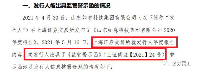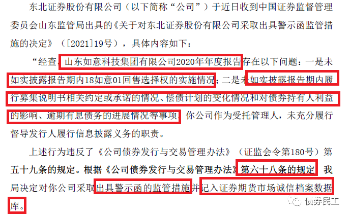 債券民工昨天在債券存續(xù)期受托管理很重要!兩家證券公司受處罰!一文中關(guān)注到,華西證券和宏信證券因債券存續(xù)期受托管理事項被證監(jiān)會四川監(jiān)管局處罰,今天就又看到了東北證券股份有限公司的公告,因未充分履行督導山東如意科技集團有限公司2020年年度報告披露義務,被證監(jiān)會山東監(jiān)管局局出具警示函的監(jiān)管措施。