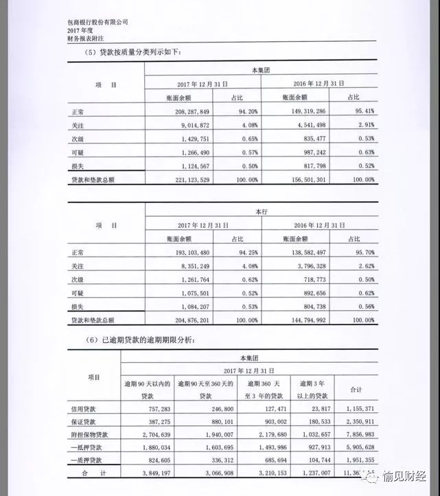 包商銀行2017年末集團口徑不良貸款率1.72%,關注類貸款4.08%,正常貸款94.20%。逾期貸款113.63億元。