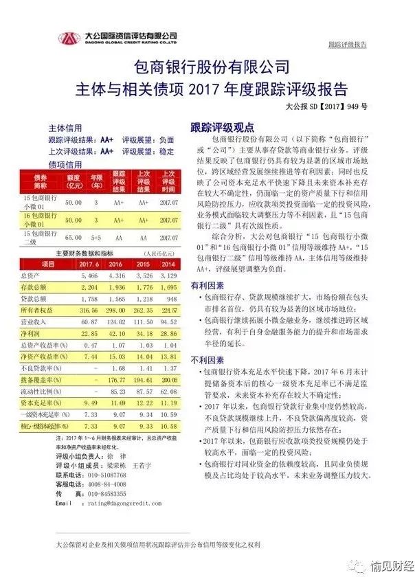 包商銀行獲得的最近的一次評級已是2017年10月,大公國際對包商銀行主體信用等級維持AA+,但評級展望調整為負面。