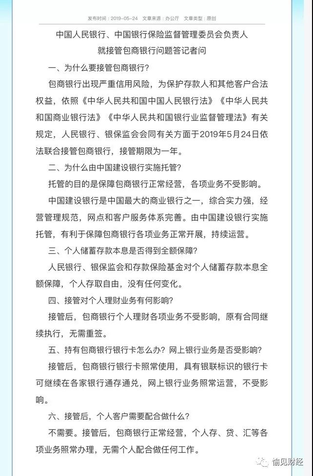 這亦與昨日央行、銀保監會的接管公告信息一致。公告稱,包商銀行“出現嚴重信用風險”,因此決定自2019年5月24日起對包商銀行實行接管,實行接管期限一年。