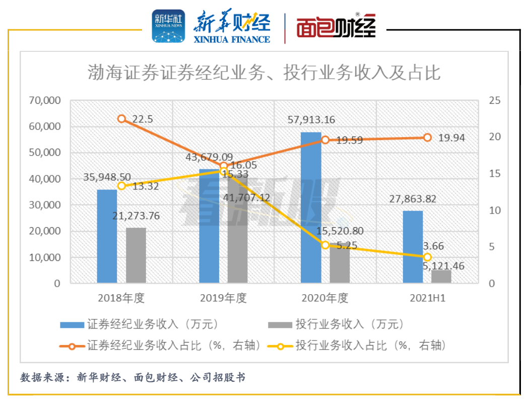 研究發現,2020年至2021年上半年,渤海證券的投行業務收入及占比有所下降,跑輸行業大盤。