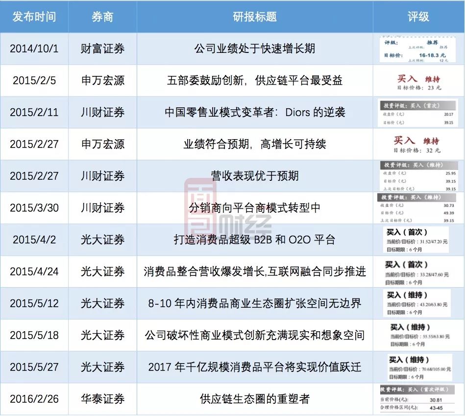 2013年,怡亞通的“深度供應(yīng)鏈業(yè)務(wù)”進(jìn)入快速發(fā)展期,公司開始被多家券商和機(jī)構(gòu)熱捧。進(jìn)入2015年前后,多家券商更是頻發(fā)研報(bào),輪番力推。粗略整理: