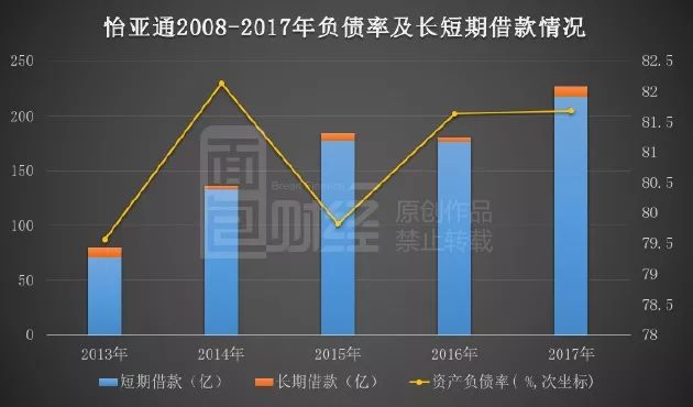 最近幾年,怡亞通的負(fù)債及負(fù)債率維持在高位。如下圖: