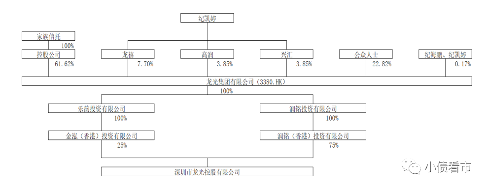從股權結構看,龍光集團通過潤銘投資和金泓投資間接持有龍光控股股權,是公司控股股東。