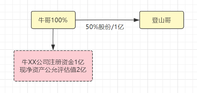 牛XX公司,雖然當(dāng)年注冊(cè)資金1億,但土地升值,按凈資產(chǎn)公允評(píng)估價(jià)2億,轉(zhuǎn)讓股份50%給登山哥,登山哥需要支付1億。