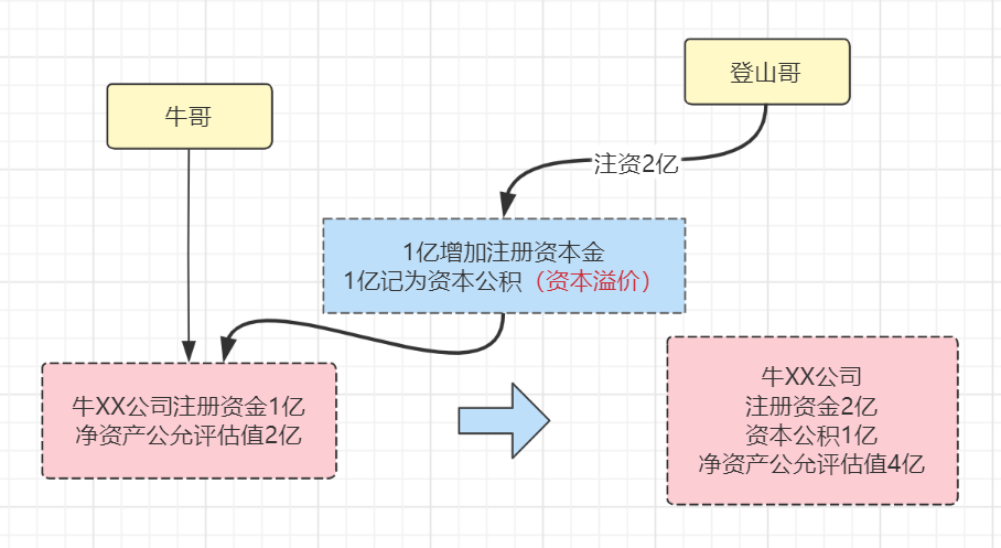 通過(guò)平價(jià)增資,登山哥需要掏2億,其中1億增加注冊(cè)資本金,1億計(jì)入資本公積。