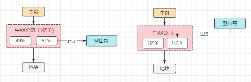 股權(quán)轉(zhuǎn)讓的與股東進(jìn)行交易——即登山哥從股東牛哥手里買(mǎi)股份,牛哥拿錢(qián)走人。