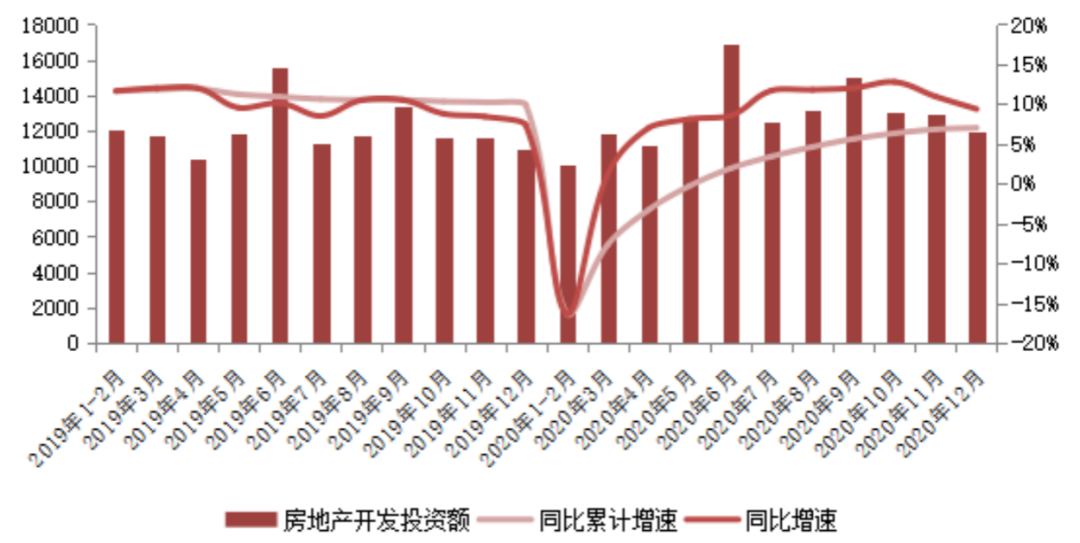 國家統計局數據顯示:2020年,全國房地產開發投資額141443億元,同比增長7%。單月開發投資規模的收窄使得全年累計規模增速出現“降速”,前12月僅較前10月漲幅僅提高0.7pts。