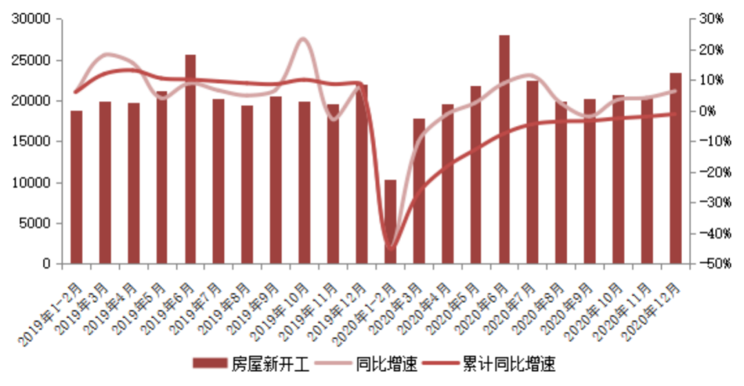 2020年房企房屋新開工面積在“三條紅線”出臺后便相應止升回落。下半年新房市場銷售表現不及預期使得房企對未來預期看淡。同時融資收緊下房企資金問題短期內難以發生根本轉變,房企對開工進度與施工強度的抉擇將受到持續影響。由于2020年房企土地購置面積依舊呈負增長,因此預計2021年可待開發土地規模有限,將拖累新開工指標,2021年新開工面積規模將繼續低位,但相比于2020年同比有望正增長,主要由于2020年規模較低且負增長,前值較低。
