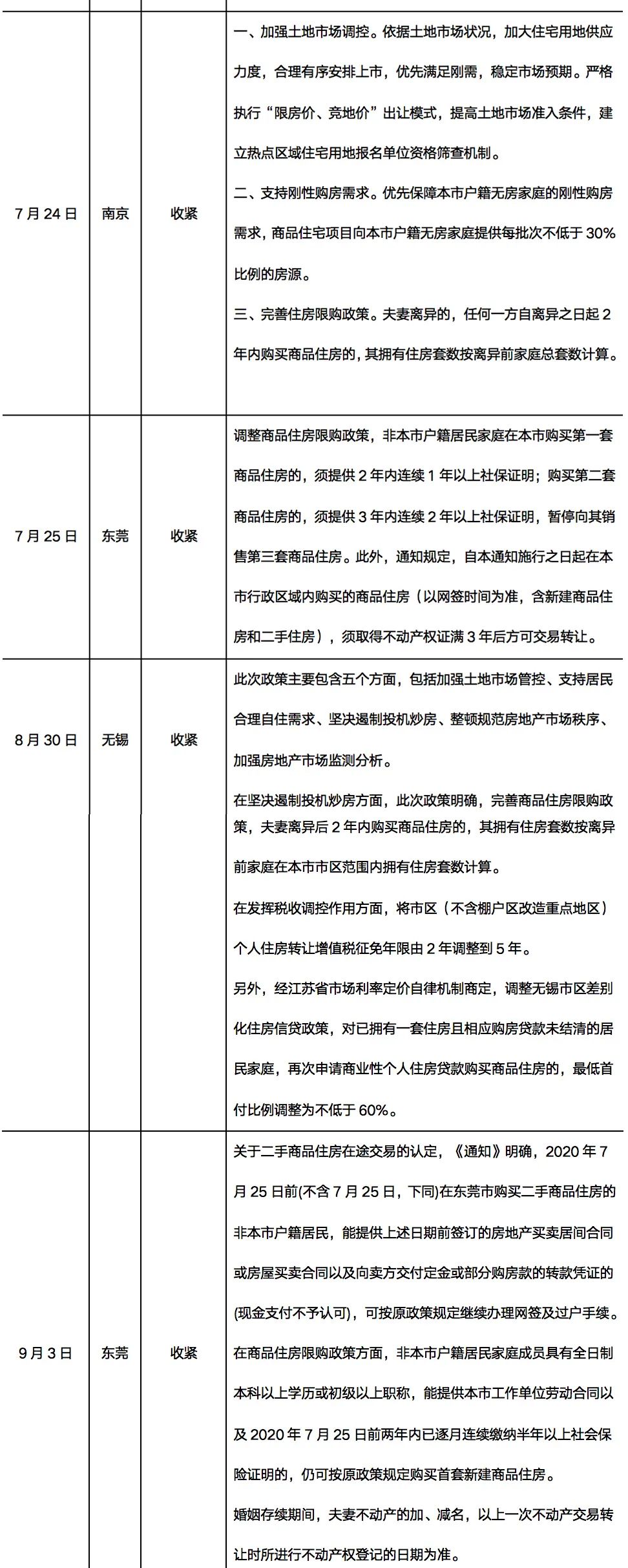 自7月25日深圳發布新政,給“假離婚炒房”打補丁以來,南京、無錫和東莞紛紛跟進。夫妻離異的,任何一方自夫妻離異之日起3年內購買商品住房的,其擁有住房套數按離異前家庭總套數計算。南京和無錫則追溯到2兩年內的購房記錄。