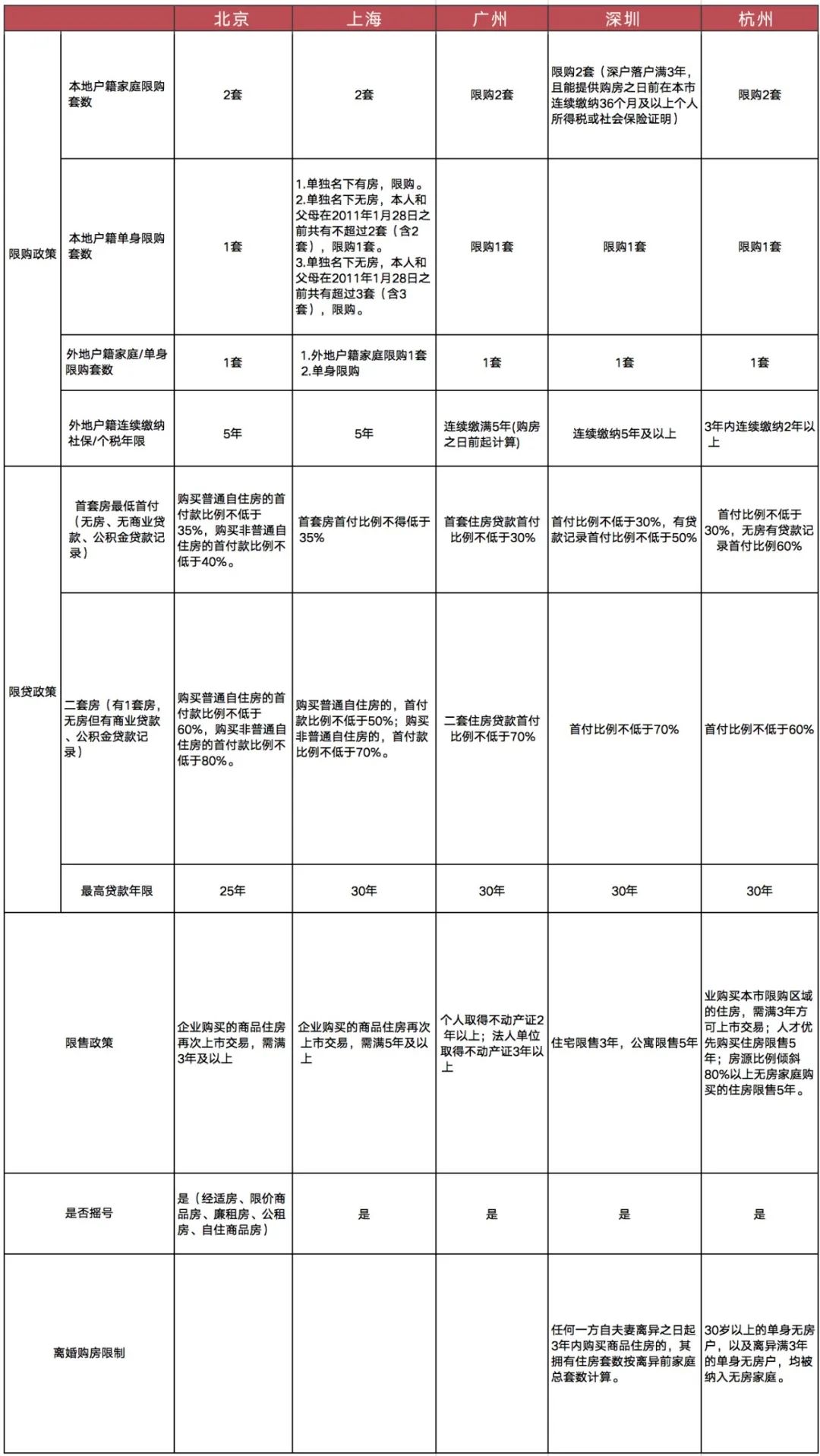 從限貸政策來看,北京和上海均對無房、無商業貸款、公積金貸款記錄的首套房設置最低首付比例為35%,廣州和深圳與其他熱點二線城市一樣,均為30%,