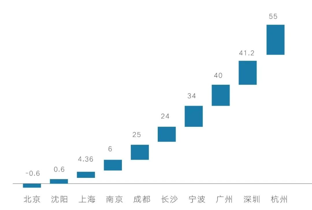 上述10城中,杭州新增常住人口以55萬人排在全國第一位,其次是深圳和廣州,分別以41.2萬人和40萬人位列第二第三。四大一線城市中北京上海增量有所減少,其中北京2019年末常住人口減少0.6萬人,上海增量也僅為4.36萬人。值得一提的是,沈陽2019年末常住人口增量僅為0.6萬人,相較于同等水平的熱點二線城市來說,差距較大,因此可以理解沈陽全面取消落戶限制這一舉措。