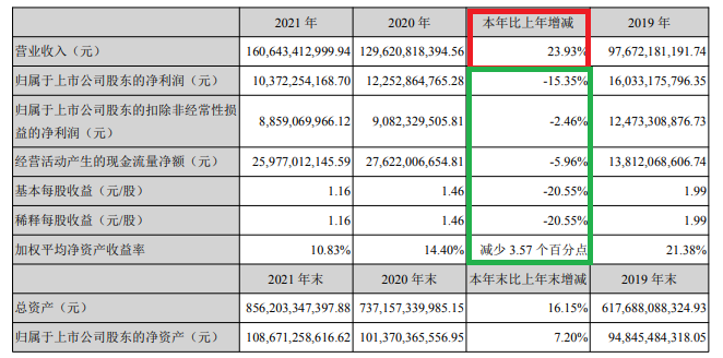 不過,歸屬于上市公司股東的凈利潤103.72億元,同比卻是減少15.35%。