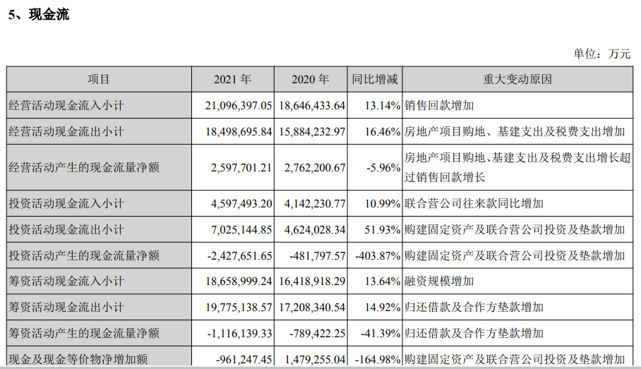 同時(shí),投資活動(dòng)產(chǎn)生的現(xiàn)金流量凈額為-242.77億元,2020年為-48.18億元,下滑403.87%年,年報(bào)解釋說購建固定資產(chǎn)及聯(lián)合營公司投資及墊款增加。