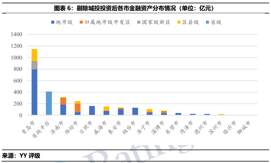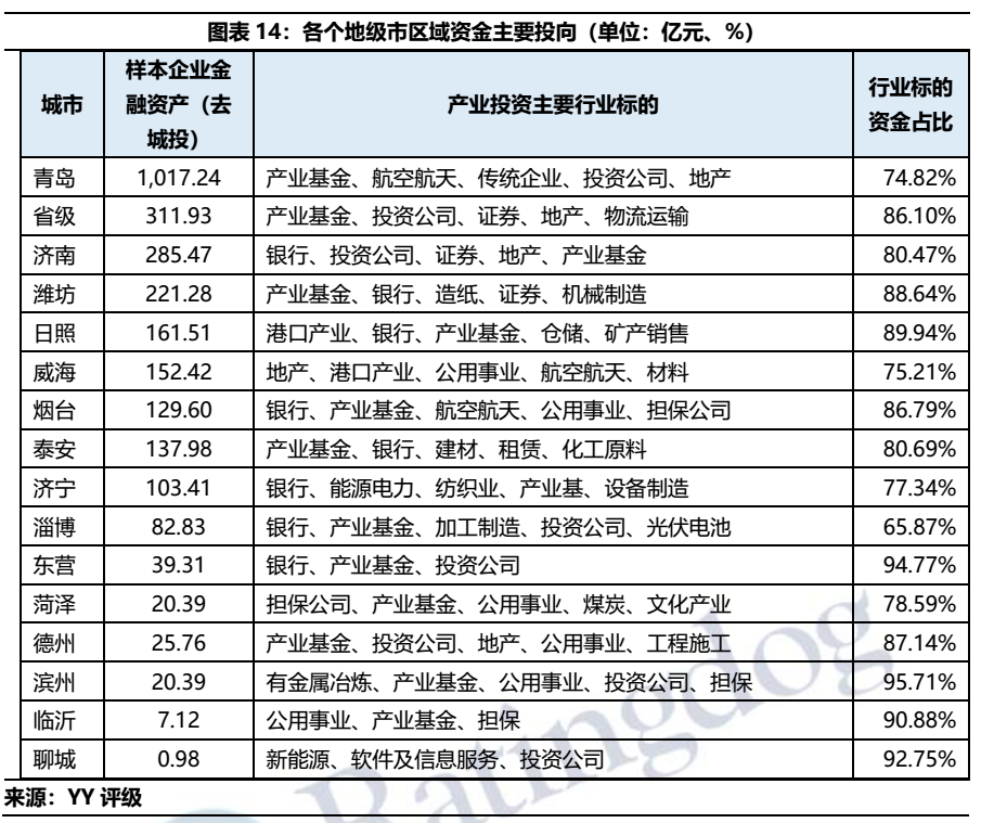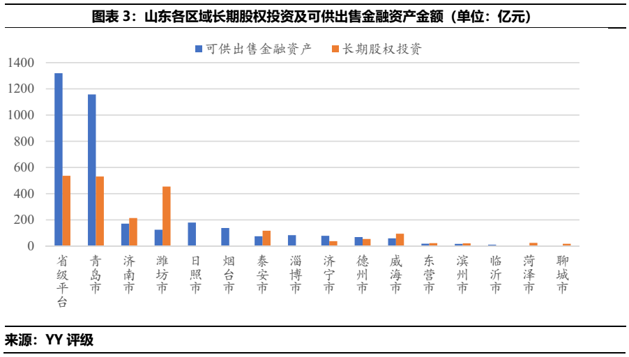 為探究山東城投產業(yè)化的方向,本文選取截至2020年末山東城投中可供金融資產或長期股權投資科目大于10億的企業(yè),就上述兩科目進行拆分,觀察各區(qū)域城投的產業(yè)投向。