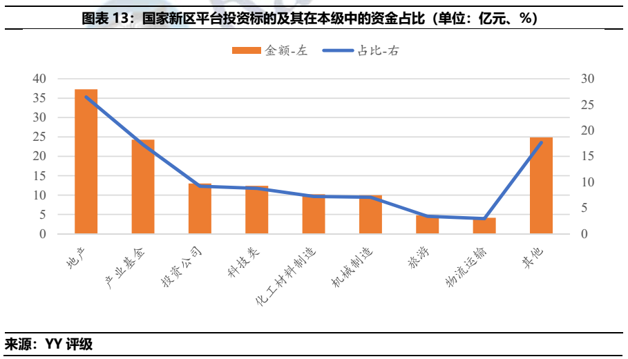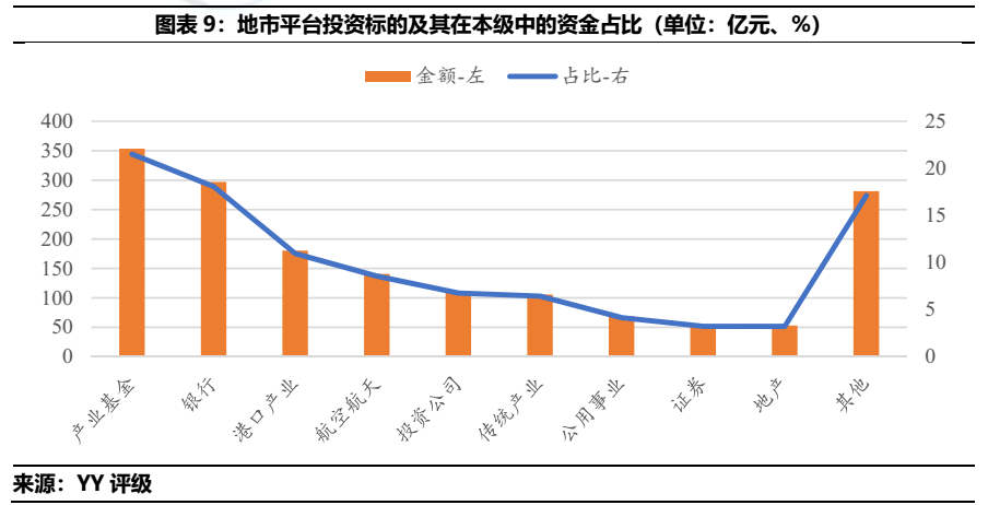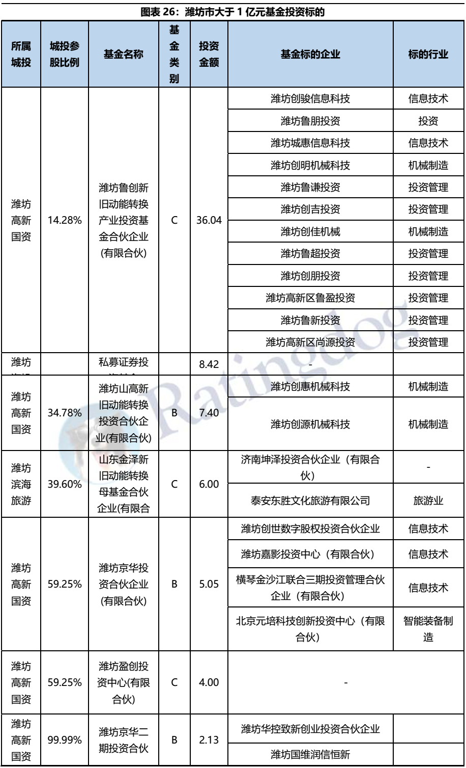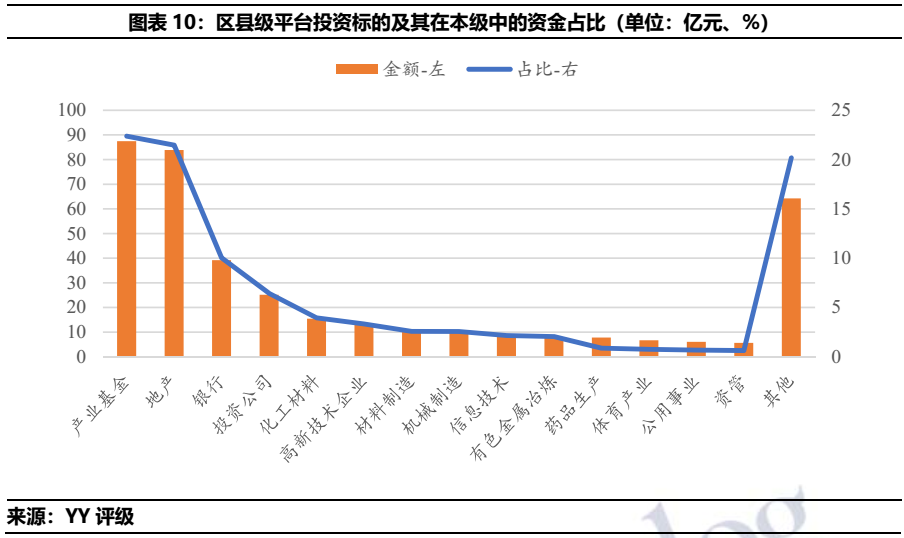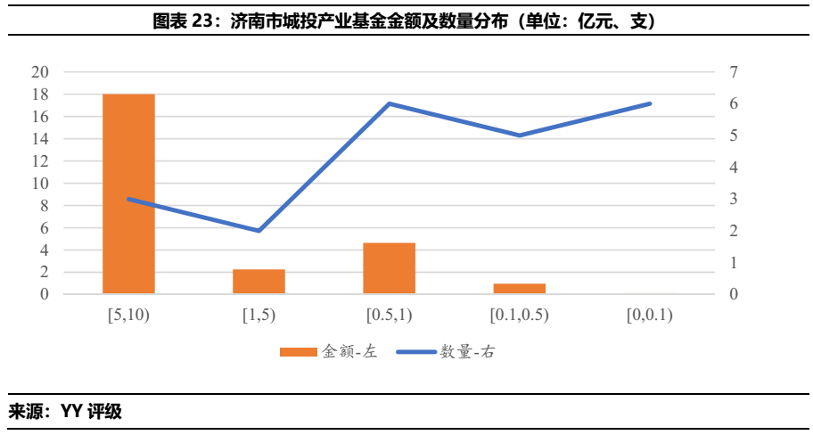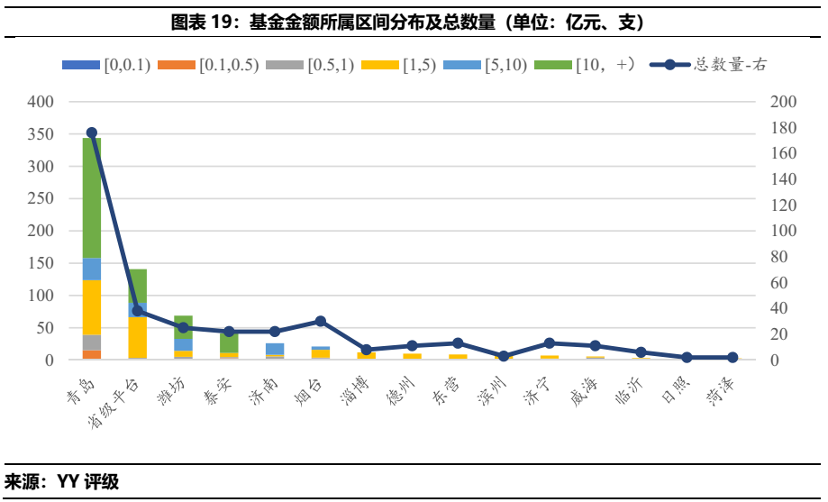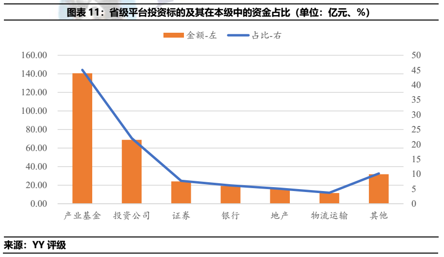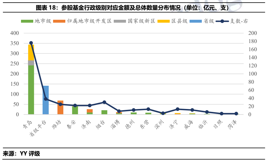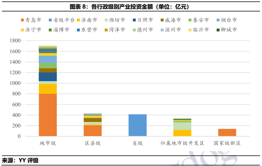 總體來看,山東城投偏好于產業(yè)基金、銀行、投資類公司的投資,上述標的投資分別占去城投類投資總額的25.52%、13.29%和9.33%。分行政區(qū)域劃分來看,僅有國家級開發(fā)區(qū)投資最多為地產行業(yè),其余皆為產業(yè)基金。分地市級來看,產業(yè)基金投資占比第一的區(qū)域分別為青島、省級平臺、濰坊、泰安和德州。銀行投資在投資金額中占比最高的區(qū)域則是濟南、煙臺、濟寧、淄博和東營。