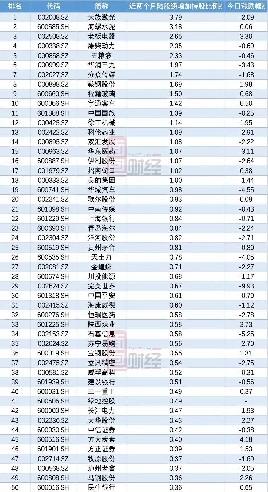 統計數據顯示:過去兩個月,在相關成分股中,陸股通持股比例增加超過0.5%的有39只個股;而持股比例增加超過2%的有5只,分別是大族激光、海螺水泥、老板電器、濰柴動力及五糧液。
