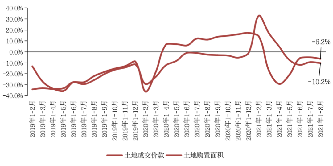 1-8月,房地產開發企業土地購置面積10733萬平方米,同比下降10.2%;土地成交價款6647億元,下降6.2%;二者較1-7月降幅分別擴大0.9和1.4個百分點。8月受到多城二輪集中供地規則調整,一二線城市土拍量價均延續低位運行。同時受土地側調控進一步深入影響,熱點三四線城市8月土拍降溫明顯,如嘉興最近一輪土拍過半數地塊未達熔斷階段即成交,3宗宅地更是底價成交。