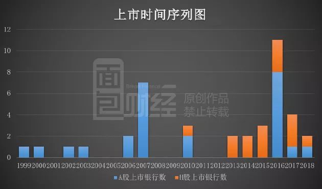以下是面包財經按首發日期為大家整理的目前已上市大陸銀行的上市時間序列圖,以此可以更直觀的看到中國銀行史上已經出現過的兩次上市大潮。