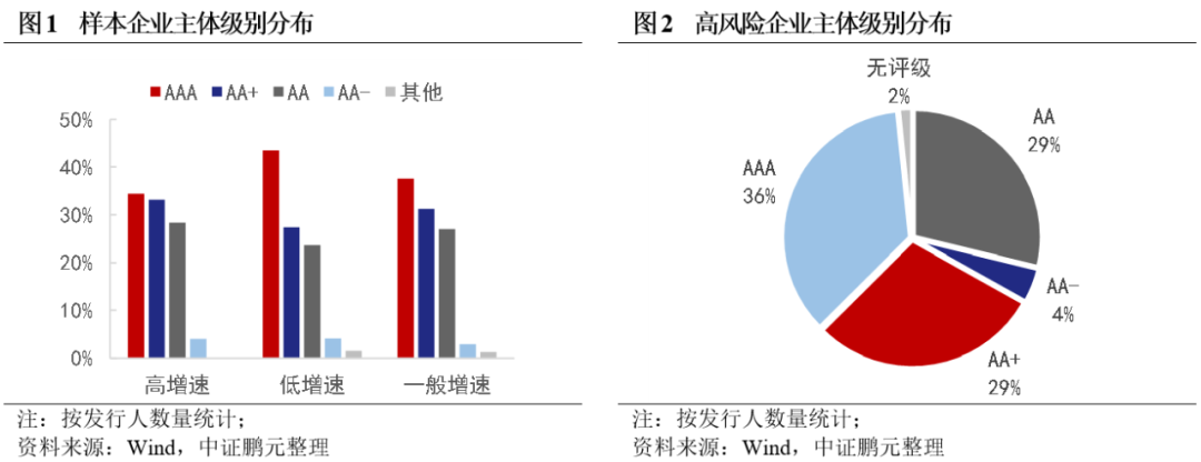 根據樣本企業存量債券數據,高增速企業主體數量級別集中在AAA和AA+級,合計占比67.7%,低于其他類型企業,其中低增速企業中AAA級企業占比43.5%,明顯高于其他類型企業。具體看高風險企業,主體級別同樣集中在高級別,AA+及以上合計占比65%左右。