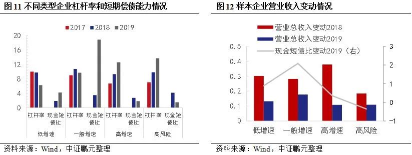 從高風險企業短期償債壓力看,平均杠桿率逐年上升,2019年現金短債比呈現下降趨勢,即本文對高風險企業的定義。與其他類型企業相比,高增速企業的杠桿率增長明顯,且在2019年明顯較高,而現金短債比下降至最低。高杠桿擴張策略并未帶來收入的快速增長,使得現金短債比出現下降,是高風險企業比較明顯的特征之一。從圖10可以看出,高增速企業中2018年收入增幅依然較高,但主要是“高杠桿,高盈利”企業的貢獻,“高杠桿,低盈利”企業的收入增速最低,且2019年現金短債比出現下降。