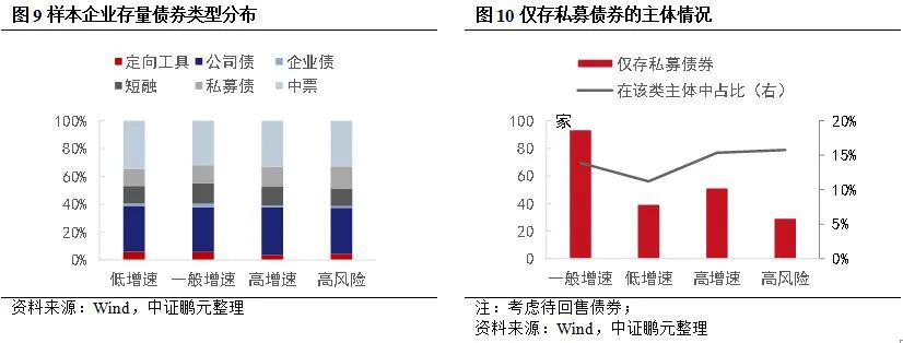 從存量債券類型看,各類型企業的存量債券均以公司債和中期票據為主,合計占比在60%以上。其中私募債券占比差異不大,但高風險企業的占比相對較高,約20%。從主體看,僅存私募發行債券的主體有183家,主要集中在一般增速企業,高風險企業占比16%。相對來說,高風險企業中僅存私募債券的主體占比較高。