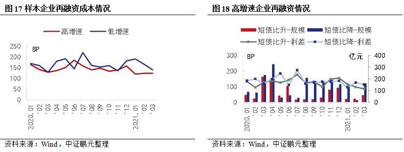 2020年債券市場發行成本與上年相比整體呈現下行趨勢,這里篩選高增速和低增速主要品種分析利差情況,具體看AAA級主體發行的1年及以上期限除權無擔保債券,從債券發行利差看,高增速企業的發行利差并非最高,主要是因為發行利差受杠桿率水平、盈利能力、公司資產質量等多方面因素影響,但2021年來,低增速企業融資成本出現下降,而高增速企業基本持平。具體看高增速企業,現金短債比帶來的融資成本差異較小,但2021年以來短債比下降的企業融資成本高于現金短債比下降的企業。此外,現金短債比下降的企業再融資規模明顯較高,尤其是融資環境較為寬松的月份。