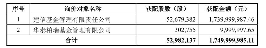 隨后,萬豐奧威在2015年12月30日非公開發行股票發行情況公告中稱,公司共發行約5298萬股,發行價格為33.03元/股,共募集基金總額約17.5億元。此次非公開發行新增股份將于2015年12 月 31日在深圳證券交易所上市,且投資者認購的本次非公開發行股票自上市之日起 12 個月內不得轉讓。而本次非公開發行的對象僅有2名,最終確定的發行對象及獲配情況如下: