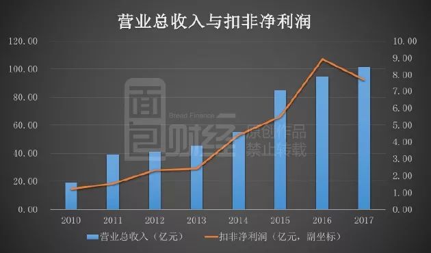 先交代一下萬豐奧威2017年的業績。公司的營業總收入突破了100億,同比增長7.29%,但歸母凈利潤與扣非凈利潤都出現了不同程度的下滑,較去年同期相比下滑分別為5.99%和13.6%,出現了增收不增利的情況。