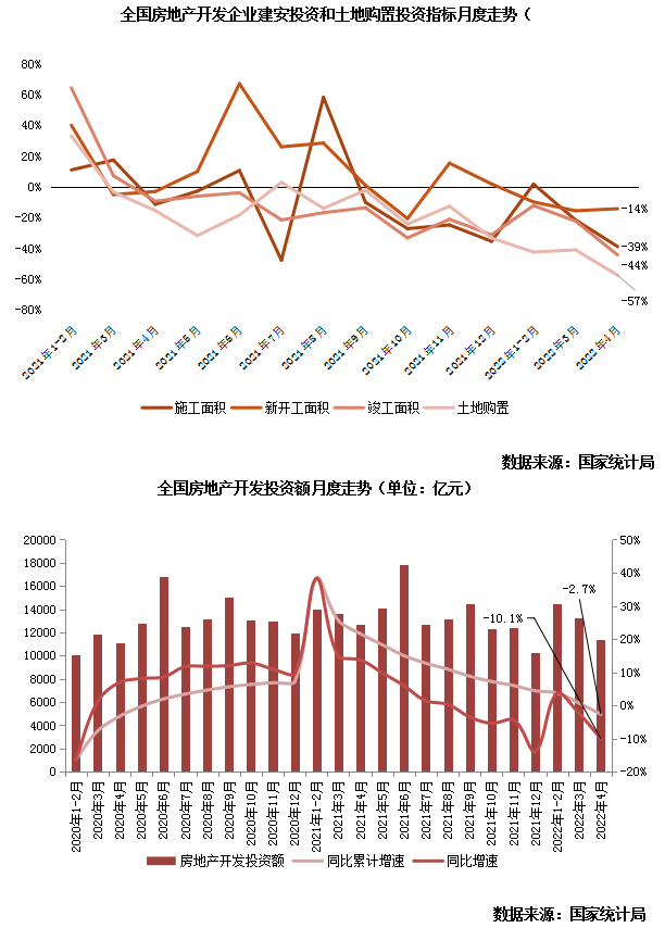 2022年4月房地產業下行趨勢加劇,新房銷售規模和企業投資規模均進一步下降。各地市密集的紓困新政尚未發揮明顯效果。從新房銷售規模、房屋施工面積和土地購置面積等指標來看,行業回暖時刻遠未到來。