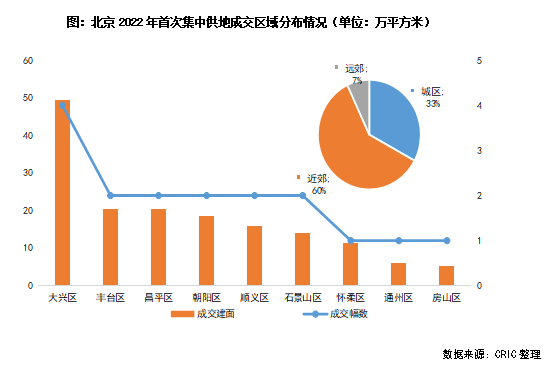 其次城區占比33%,豐臺區、朝陽區和石景山區各成交2宗地塊;遠郊僅懷柔區出讓1宗懷柔老城板塊的綜合用地,建筑面積占比為7%。