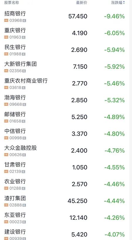 招商銀行跌幅超9%,中國平安繼續慘。