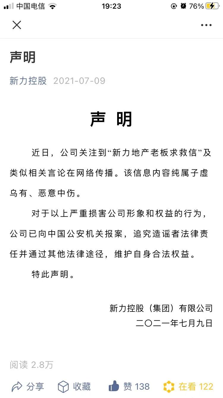 聲明稱,網上近日傳播的關于“新力地產老板求救信”及類似相關言論內容為子虛烏有,惡意中傷。目前,公司已向公安機關報警,追究造謠者法律責任。