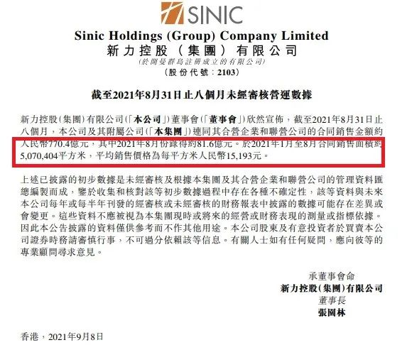 日前,新力控股集團公布的最新銷售情況看,前8月新力控股實現合同銷售金額約770.4億元,對應銷售面積為507.04萬平米,平均銷售價為15193元/平米。