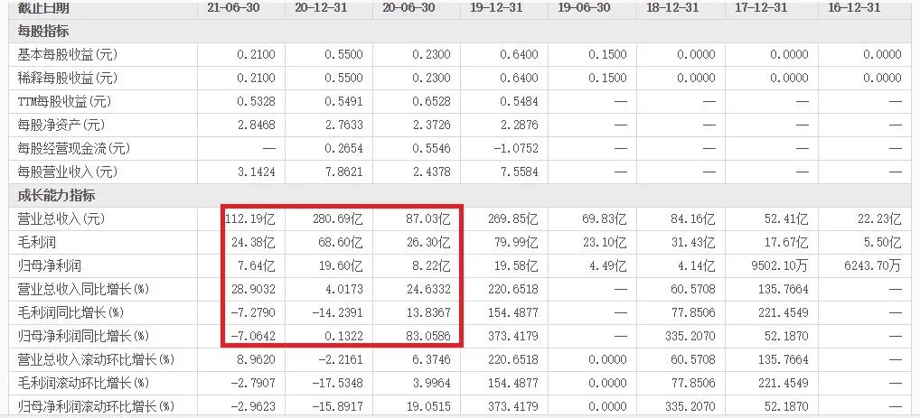 2021上半年毛利24.38億元,同比下降7.28%。